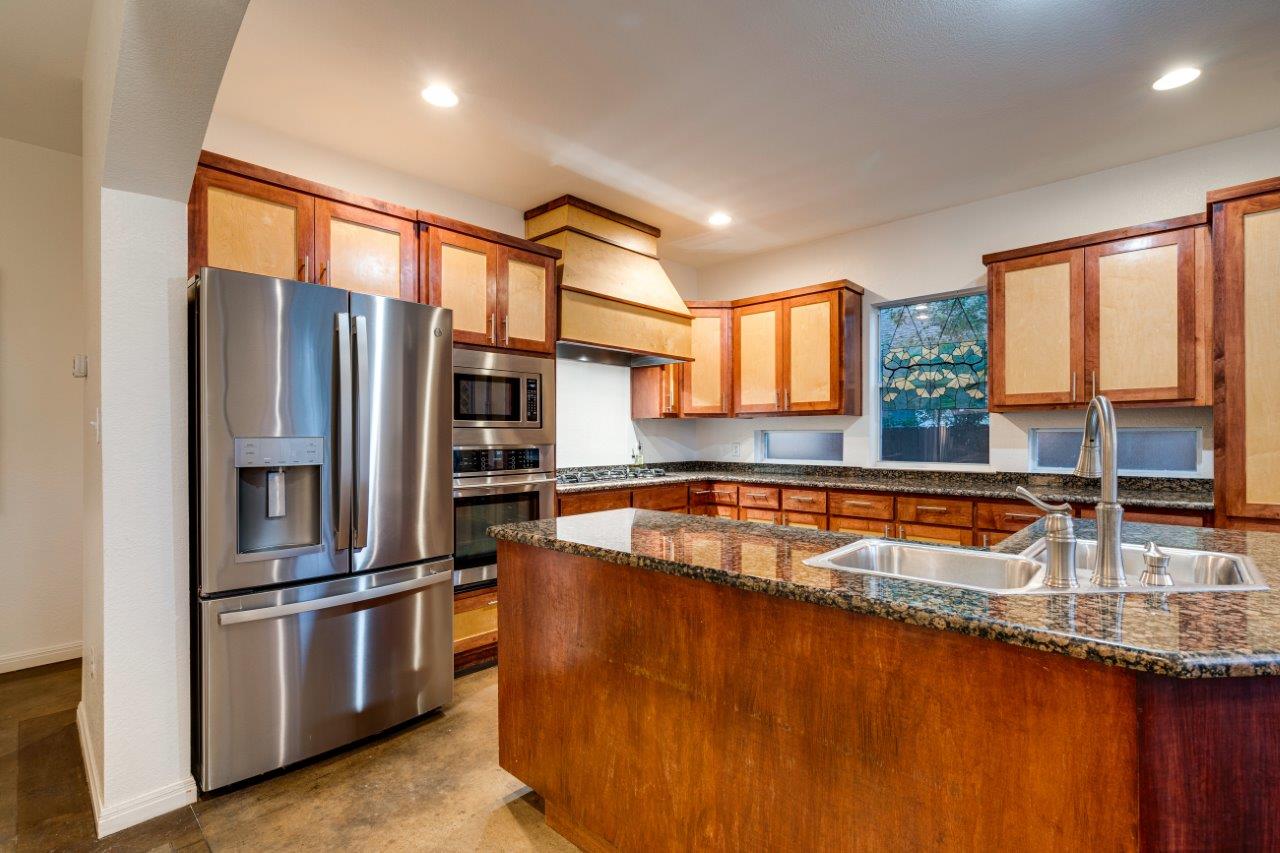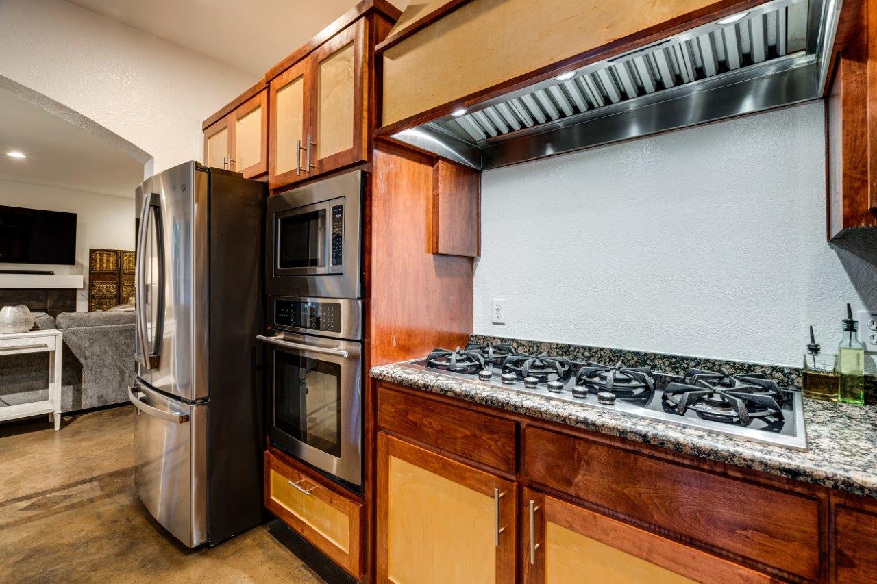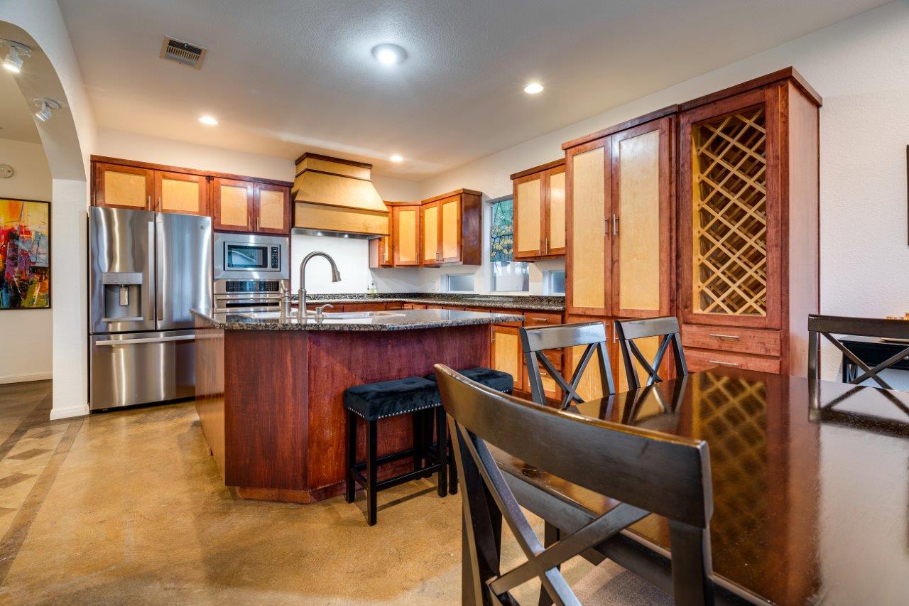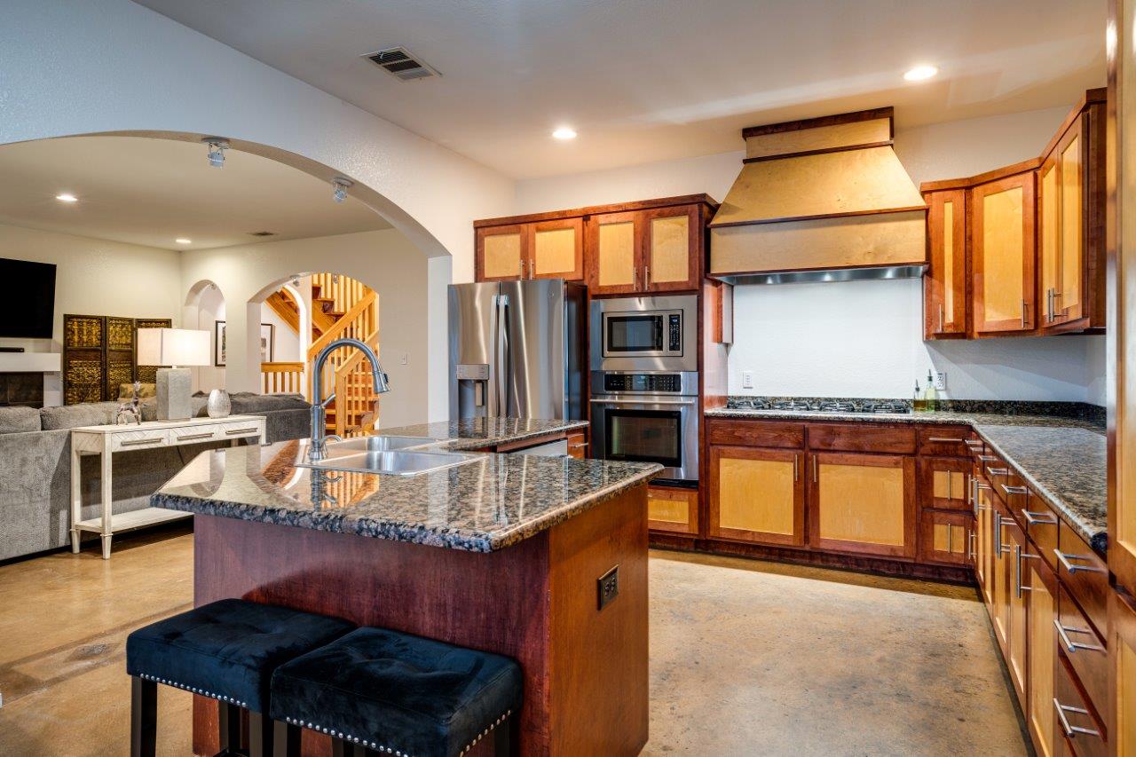 - The kitchen features built-in stainless appliances, ample counter space, and a breakfast area, perfect for your culinary creations.